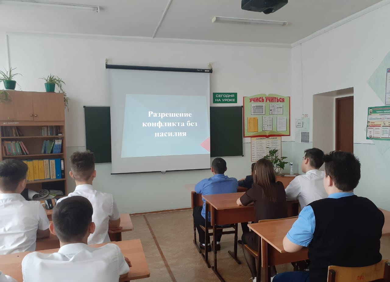 08 декабря 2021 года в 7,9 классах прошел классный час на тему "Разрешение конфликтов без насилия". Во время классного часа речь шла о необходимости разрешения любых конфликтных ситуаций мирным путем, не применяя никакие виды насилия: ни физические, ни психологические. Предлагались различные ситуативные задания для разрешения конфликтов мирным путем, ролевые игры.