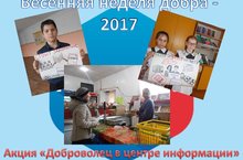 В рамках «Весенней недели добра – 2017» 19 апреля прошла акция «Доброволец в центре информации». В ходе акции был проведен конкурс стенгазет среди учащихся 6-7 классов на тему «Электронные услуги для всех». А учащимися 4 и 5 классов был разработан буклет для жителей поселения «Госуслуги - проще, чем кажется», где отражена информация о преимуществах и принципах работы Единого портала государственных и муниципальных услуг.