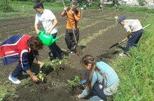 8 июня дети пришкольного лагеря работали на школьном огороде, пололи и поливали грядки, сажали помидоры и капусту.