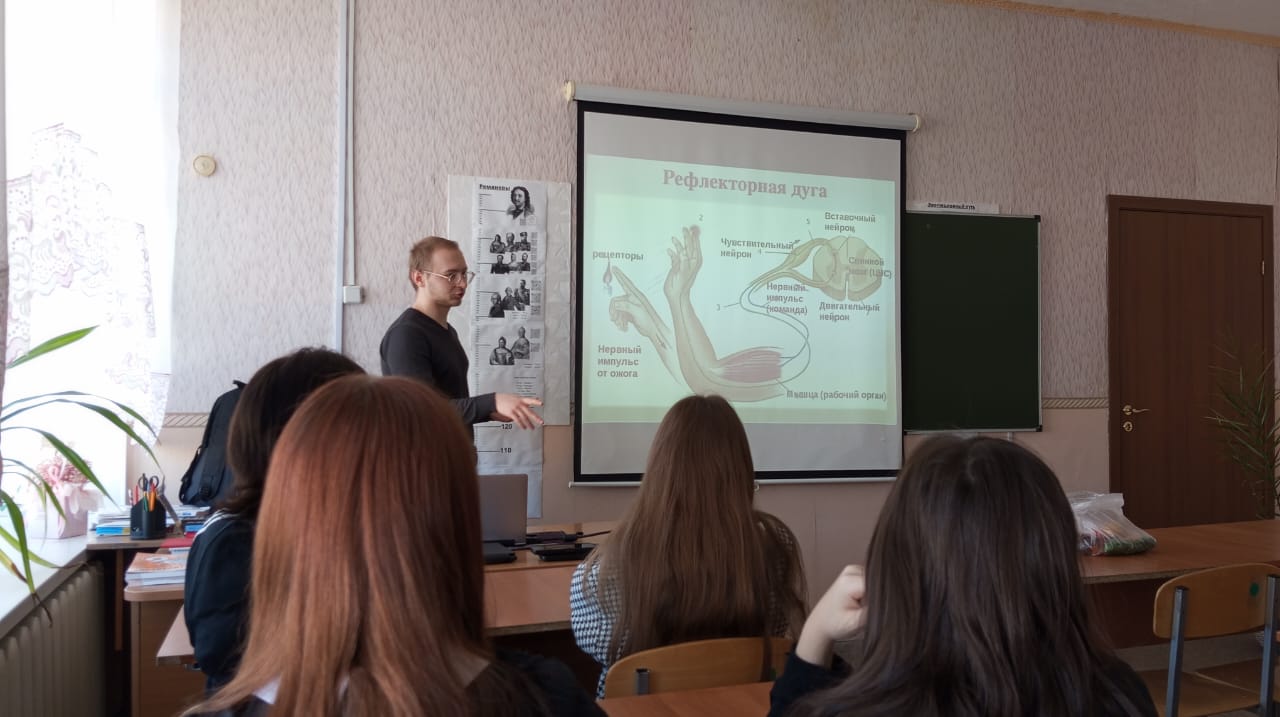 Максимом Сергеевичем была представлена тема «Нервная регуляция. Рефлекс. Понятие о рефлексе». В ходе занятия были даны определения «физиология», «регуляция», «рефлекс», «рецепторы». Более подробно была представлена нервная регуляция, ее механизм действия, даны отличия условных рефлексов от безусловных, описаны пять звеньев рефлекторной дуги, показаны различные рецепторы, находящиеся в коже человека. Лектор в ходе своего выступления использовал познавательную и красочную презентацию, в которой были представлены схема рефлекторной дуги у человека, коснувшегося горячего предмета, а также схема выработки условного рефлекса на звонок у собаки.