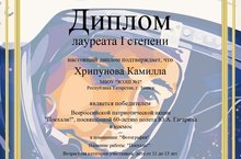 Активисты РДШ школы №1 приняли участие в Всероссийской патриотической акции "Поехали!", посвященной 60-летию полёта Ю.Гагарина в космос. Ученица 6а класса Хрипунова Камилла заняла 1 место. Диплом куратора за подготовку победителя получила А.М. Кондрабаева.