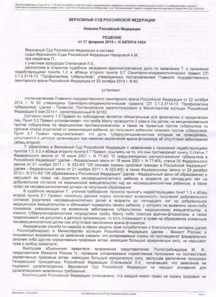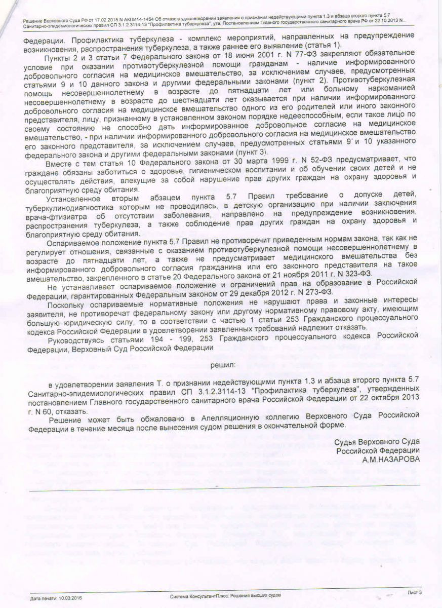 Разъяснения правового обоснования при отказах от туберкулинодиагностики и обследования у врача - фтизиатра среди родительской общественности