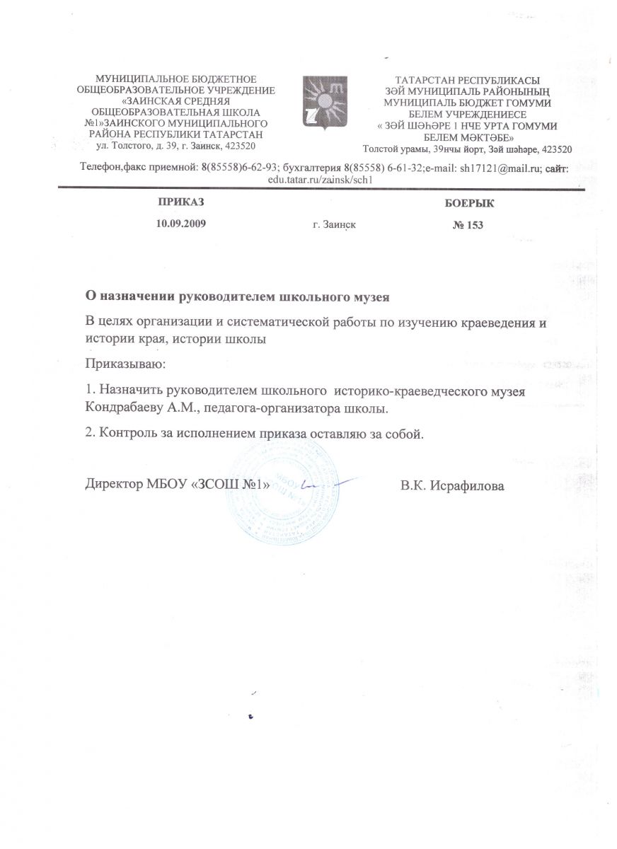Приказ № 153 от 10_09_2009 О назначении руководителя школьного музея.jpg
