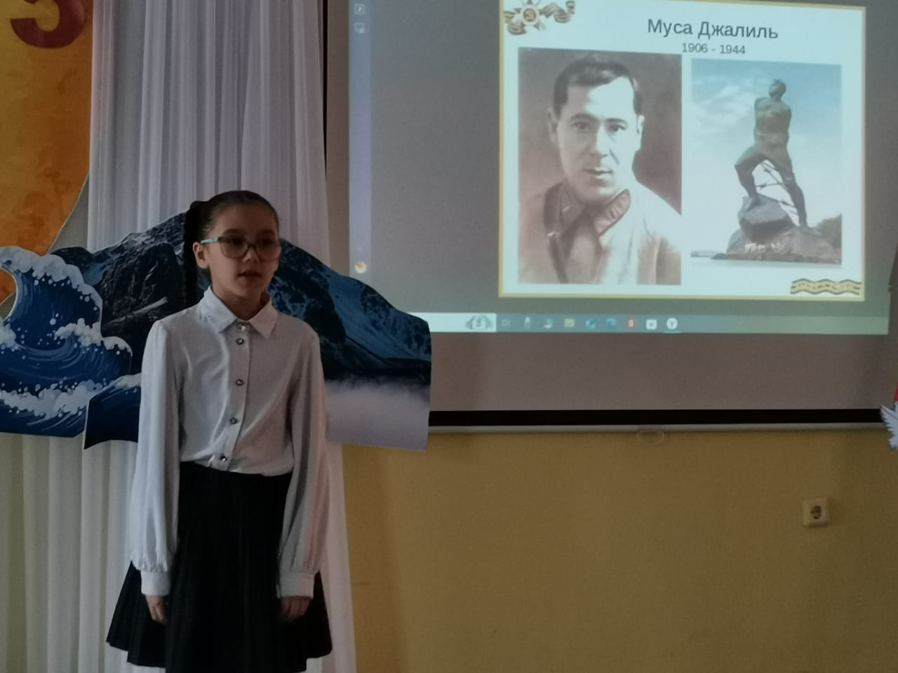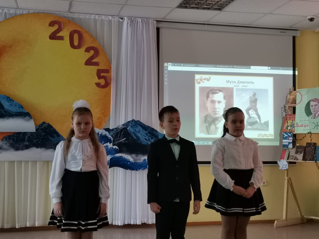 15 февраль көнне 2 нче мәктәптә «аның исеме безнең йөрәкләрдә»дип исемләнгән класстан тыш чара үткәрелде. Күргәзмәдә танылган шагыйрьнең тормышына һәм иҗатына багышланган китаплар һәм журнал мәкаләләре тәкъдим ителде. 2, 5, 7 сыйныф укучылары Муса Җәлил шигырьләрен укыдылар. Светлана Гарифҗановна укучыларны татар шагыйренең биографиясе һәм иҗаты белән таныштырды. Шулай ук китаплар күргәзмәсе дә әзерләнде.