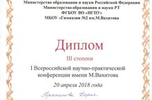 20 апреля ученица 5 класса Герасимова участвовала в I Всероссийской научно-практической конференции им. М. Вахитова, г.Набережные Челны, и заняла 3 место (руководитель работы учитель родного языка и литературы Хайрутдинова Ф.С.) Поздравляем! -