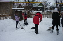 Сильные снегопады посетили наш район. Школьники вышли на расчистку территории школы. В поселке проживают труженики тыла. Ученики 8-го класса отправились на помощь ветеранам, расчистили тропинки и площадки.
