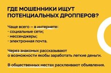 Кто обычно становится дроппером? Дропперов ищут в интернете: через социальные сети, мессенджеры, электронную почту, заманивая лёгким заработком и удалённой работой. К человеку предъявляется лишь одно требование – наличие банковской карты или онлайн банка. Поскольку банковская карта доступна для оформления с 14 лет, в тайне от родителей дропперами могут стать и подростки.