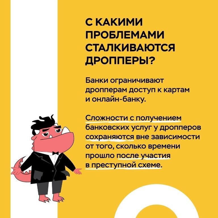 Персональные риски дропперов. Дропперам грозить уголовная ответственность. Им может быть назначено наказание от крупного штрафа до лишения свободы. Наказание за дропперскую деятельность предусмотрено не зависимо от того, знал ли человек о том, чем занимается. Владельцы банковских карт несут персональную ответственность по всем операциям. Также у дроппера могут возникнуть сложности с банковским обслуживанием, так как информация о них передается в базу данных Банка России, к которой имеют доступ все банки. Последние приостанавливают дропперу доступ к картами онлайн-банку. Не стоит забывать и про имущественную ответственность. Обманутые люди будут обращаться в суд с требованиями вернуть украденные деньги. Суд может обязать дроппера их выплатить.