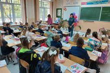 С учащимися 1 классов был проведен Урок безопасности на котором напомнили детям о правилах безопасного поведения в школе и в быту, после обсуждения теоретических знаний о том, как не допустить пожаров из-за детской шалости с огнём, предотвратить гибель детей в огне, инспектор привел примеры различных ситуаций, в которых могут оказаться дети, и оценил правильность действий отвечающих. Ребята активно принимали участие в беседе, как выяснилось, у многих дома имеются первичные средства пожаротушения, в том числе установлен автономный пожарный извещатель. Затем была проведена практическая тренировка по эвакуации учащихся и сотрудников из здания.