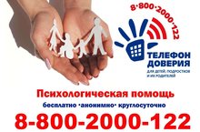 Телефон доверия 8-800-2000-122 создан для оказания психологической помощи детям, подросткам и их родителям в трудных жизненных ситуациях. Звонок бесплатный и анонимный. Квалифицированные психологи готовы в любое время помочь детям и подросткам справиться с трудной жизненной ситуацией, выслушать, подсказать, как правильно поступить, если возникли сложности. Психологи готовы дать консультацию и родителям, если у них возникли сложности с ребенком или они не знают, как ему помочь справиться с проблемами.