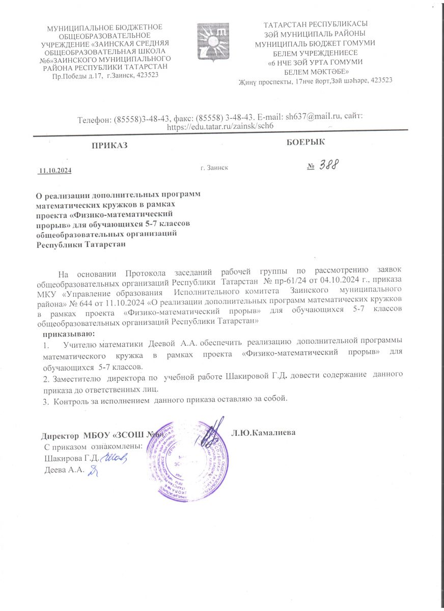 Приказ ОО от 11.10.2024г. №388 "О реализации дополнительных программ математических кружков в рамках проекта "Физико-математический прорыв" для обучающихся 5-7 классов общеобразовательных организаций Республики Татарстан