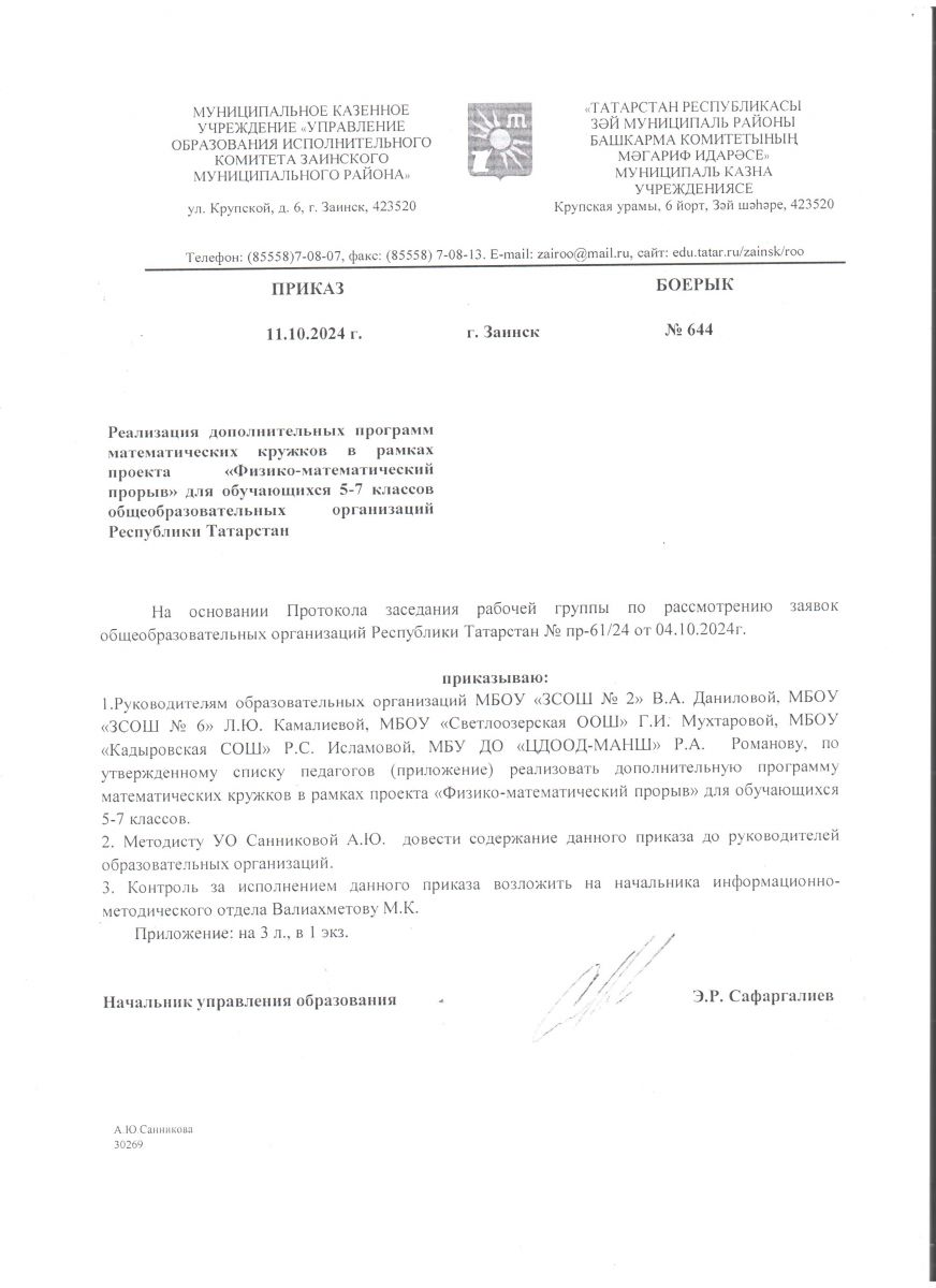 Приказ МКУ (Управление образования ИК ЗМР" от 11.10.2024г. №644 "Реализация дополнительных программ математических кружков в рамках проекта "Физико-математический прорыв" для обучающихся 5-7 классов общеобразовательных организаций Республики Татарстан