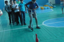 На расстоянии 8-10 м. от линии старта положить скакалку и обруч. После сигнала 1-ый, добежав до скакалки, берет ее в руки, делает на месте три прыжка, кладет и бежит назад. 2-ой берет обруч и делает через него три прыжка и идет чередование скакалки и обруча. Чья команда быстрее справится, та и победит. -