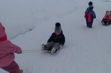 Санки сопровождают ребенка всю жизнь. Ребенка первого года жизни на санках катают взрослые, 2—3-летний ребенок сам возит санки за веревочку, катая кукол. На четвертом году жизни дети катают на санках друг друга по дорожке.