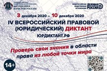 С 3 по 10 декабря 2020 года в целях оценки уровня правовой грамотности населения пройдет Четвертый Всероссийский правовой (юридический)диктант. Соорганизаторами Диктанта выступают Общероссийская общественная организация «Ассоциация юристов России» и Общероссийская общественная организация «Деловая Россия» при поддержке Федерального государственного бюджетного образовательного учреждения высшего образования «Московский государственный юридический университет имени О.Е. Кутафина (МГЮА)». Основные задачи Диктанта – повышение мотивации различных слоев населения к изучению права, получение объективной информации об уровне правовой грамотности населения России с учетом его возрастной и социальной структуры, привлечение средств массовой информации и российского общества к вопросу повышения уровня правовой культуры населения, выработка предложений по совершенствованию образовательных программ. В условиях распространения новой коронавирусной инфекцииCOVID-19 Диктант проводится в режиме онлайн на официальном портале юрдиктант.рф.