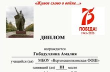 Конкурс проходил в дистанционном формате с 25 апреля по 15 мая 2020 года. Учащиеся конкурса читали и рассказывали стихотворения, посвященные 75-летию Победы в Великой Отечественной войне «Живое слово о войне…». Ученица 1 класса Гибадуллина Амалия заняла 3 место.